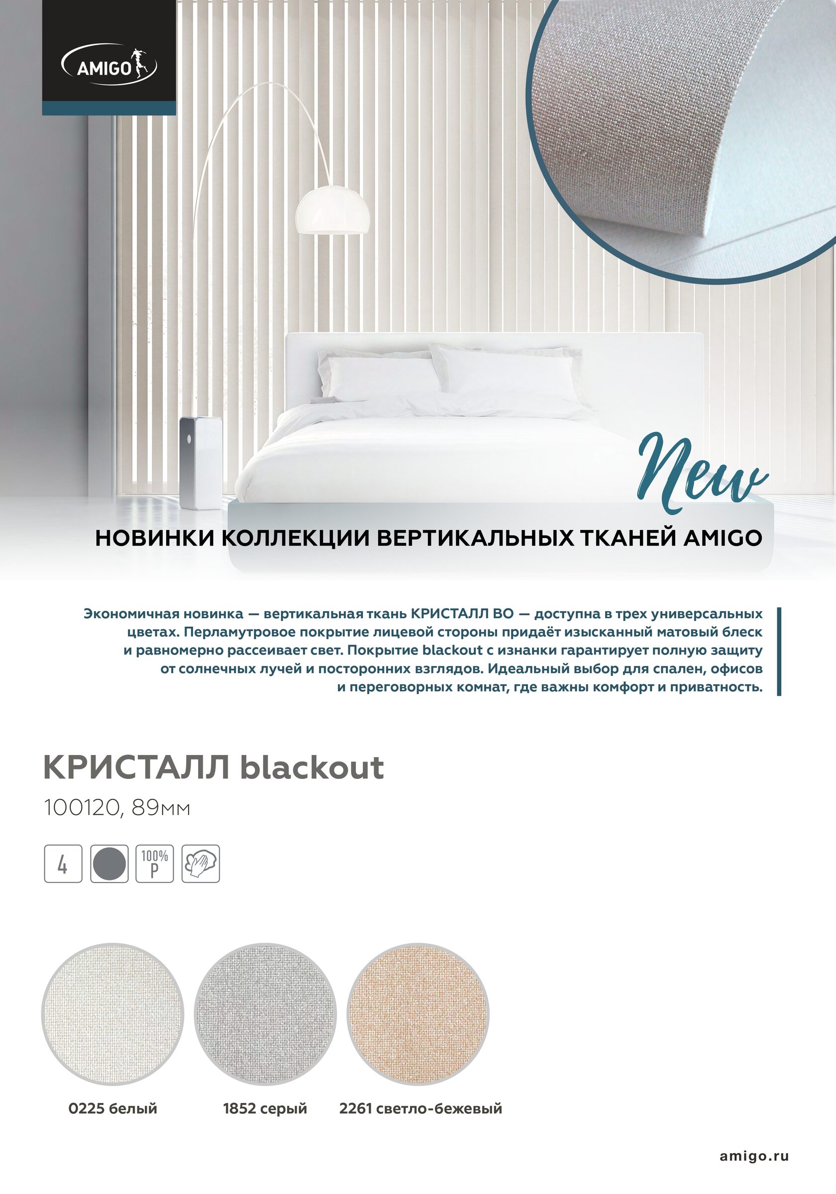 Экономичная новинка — вертикальная ткань КРИСТАЛЛ BO — доступна в трех универсальных цветах. Перламутровое покрытие лицевой стороны придаёт изысканный матовый блески равномерно рассеивает свет. Покрытие blackout с изнанки гарантирует полную защиту от солнечных лучей и посторонних взглядов. Идеальный выбор для спален, офисов и переговорных комнат, где важны комфорт и приватность.